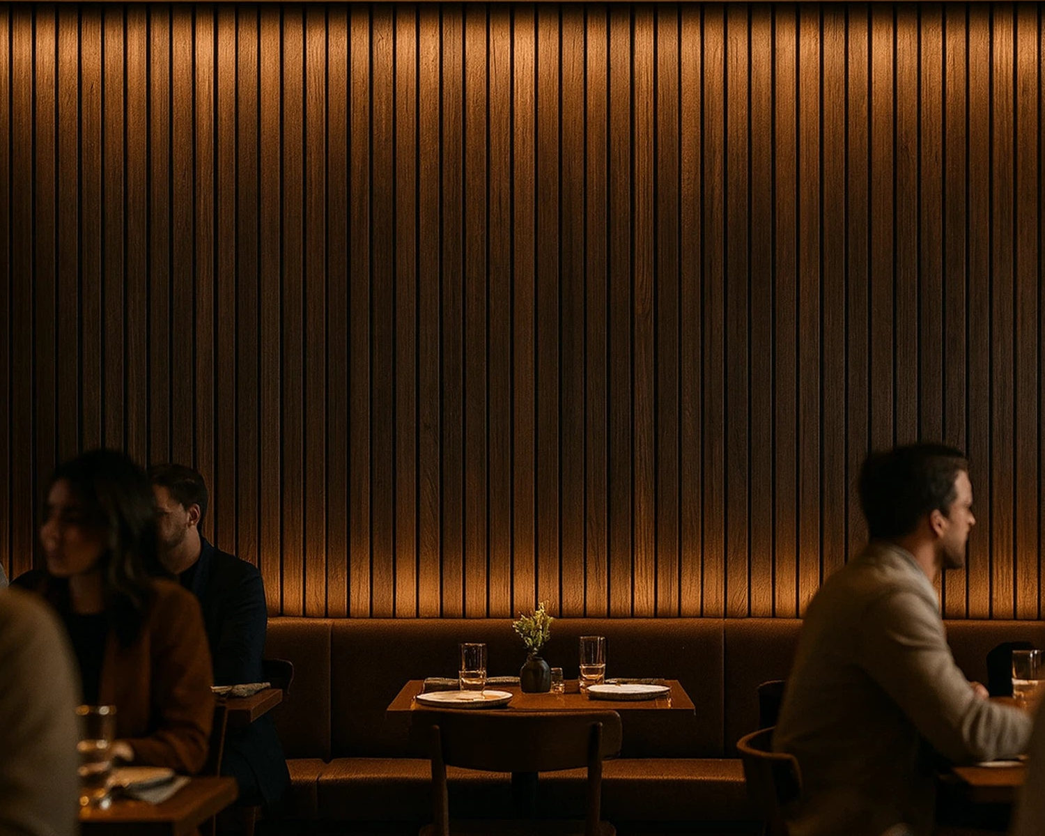 Woodson brings modern warmth with real-wood slats—and calms the room at the same time. Our felt-backed acoustic panels reduce harsh reflections so spaces look refined and feel quiet.