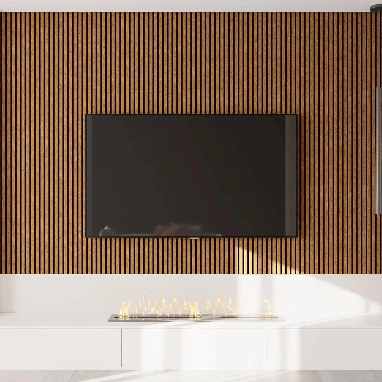 - Cut the Acoustic Wood Panel and install it around the TV or shelf. In this case, the wall behind will be visible.